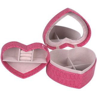 Шкатулка для украшений "Дженнифер" выполнена в форме сердца 15*13*8 см из лаковой розовой искусственной кожи с декоративным тиснением под кожу рептилии. Шкатулка двухъярусная, верхний ярус вынимается и состоит из четырёх отсеков, один из которых оборудован валиками для колец, нижний ярус разделён на четыре отделения. Внутренняя сторона крышки оборудована зеркальцем, также выполненным в форме сердца. Внутренняя поверхность шкатулки оформлена светлым флоком, что придаёт ей шарм и изысканность.