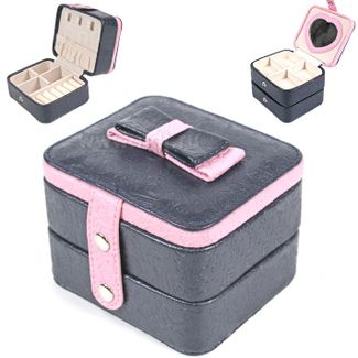Шкатулка для украшений размером 11*9*8 см двухъярусная и выполнена из искусственной кожи. Нижнее отделение содержит пять отсеков для украшений, включая отсек с валиками для колец. Там же расположены крючки и кармашек для цепочек и браслетов. Верхнее отделение разделено на четыре отсека. Внутренняя сторона крышки оборудована зеркальцем. Внутренняя поверхность шкатулки оформлена светлым флоком, что придаёт ей шарм и изысканность.