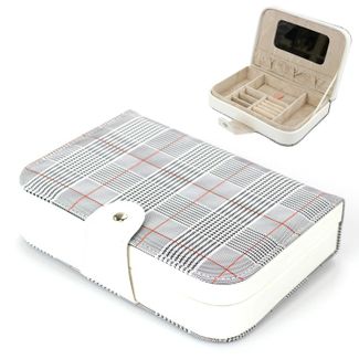 Шкатулка для украшений выполнена в виде книжки 20*14*5 см из искусственной кожи со стильным рисунком. Шкатулка одноярусная, состоит из множества отсеков для разделения украшений по видам и коллекциям, включая отсек с валиками для колец. Внутренняя сторона крышки оборудована зеркалом и кармашком по всей ширине крышки. Чемоданчик закрывается с помощью заклёпки. Внутренняя поверхность шкатулки оформлена светлым флоком, что придаёт ей шарм и изысканность.