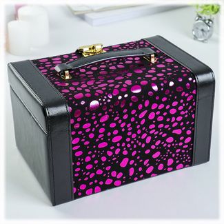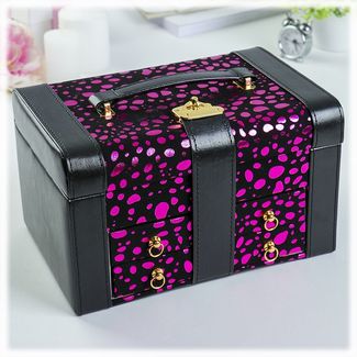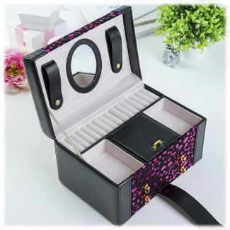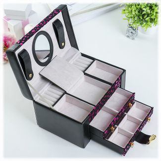 Шкатулка для украшений выполнена в виде сундучка 24*16*14 см из искусственной кожи с яркой расцветкой. "Фелисия" - удобная трёхъярусная шкатулка. Нижний ярус представляет собой выдвижной ящик с шестью отделениями для разных коллекций украшений. Второй ярус - это выдвижной ящик, разделённый на две части. В верхнем ярусе расположены четыре основных отделения, одно из которых оборудовано валиками для удобного хранения колец. Внутренняя сторона крышки оборудована зеркалом 9*7 см и петлями для хранения браслетов и цепочек. Шкатулка закрывается на поворотный декоративный замок и имеет удобную ручку-переноску. Внутренняя поверхность шкатулки оформлена искусственной светлой замшей, что придаёт ей шарм и изысканность.