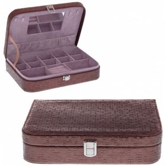 Шкатулка для украшений выполнена в виде клатча 27*19*6 см из текстурной искусственной кожи с декоративным тиснением. Шкатулка "Илиана" одноярусная, разделена на множество разнообразных отсеков, один из которых оборудован валиками для колец, а внутренняя сторона крышки оснащена крючками для цепочек и зеркалом. Внутренняя поверхность оформлена бархатистым светлым материалом, что придаёт ей шарм и изысканность.