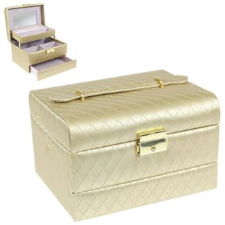 Шкатулка для украшений выполнена в виде сундучка 18*15*12 см из золотистой матовой искусственной кожи. Шкатулка "Ирма" трёхъярусная, полный автомат. Нижний выдвижной ярус состоит из одного плоского отделения, средний ярус разделён на четыре вместительных отсека для хранения крупных украшения и бижутерии, в верхнем ярусе расположены два отделения, одно из которых оснащено валиками для колец. Внутренняя сторона крышки оборудована зеркальцем. Шкатулка закрывается на замок-защёлку с ключиком и имеет удобную ручку-переноску. Внутренняя поверхность шкатулки оформлена светлым флоком, что придаёт ей шарм и изысканность.