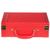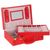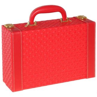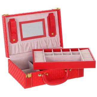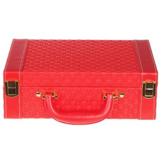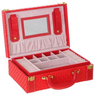 Шкатулка для украшений выполнена в виде двухъярусного чемоданчика 27*19*9 см красного цвета из лаковой искусственной кожи с текстурным декоративным плетением. Съёмное отделение содержит два боковых отсека с валиками для колец, а также одно большое отделение для бижутерии и восемь небольших одинаковых отсеков для ювелирных украшений. Внутреннее отделение разделено на шесть равных отсеков. Внутренняя сторона крышки оборудована зеркальцем 11*7 см, кармашком по всей ширине шкатулки и двумя хлястиками с отверстиями для серёжек. Чемоданчик закрывается с помощью двух металлических замков и имеет удобную ручку-переноску. Внутренняя поверхность шкатулки оформлена искусственной светлой замшей, что придаёт ей шарм и изысканность.
