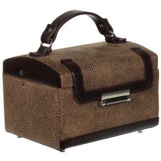 Шкатулка для украшений выполнена в виде сундучка 22*17*15 см из текстурной искусственной кожи интересного дизайна под кожу рептилии. "Лима" - вместительная трёхъярусная шкатулка. В верхнем ярусе расположены четыре отделения, среди которых - отсек с валиками для колец, а также отделение, закрывающееся крышечкой . Второй ярус представляет собой выдвижной ящик, разделённый на два продолговатых отсека для цепочек и браслетов. Третий ярус также выдвижной и состоит из одного вместительного отделения, в нём расположена очень продуманная дорожная шкатулка. Эту мини-шкатулку размером 12*9*6 см удобно брать собой в любую поездку или путешествие, чтобы не расставаться с милыми сердцу украшениями - она выполнена в едином стиле с основной шкатулкой, разделена на четыре отсека и оборудована для удобного размещения колец, серёжек и цепочек. Отделения внутри дорожной шкатулки продуманы до мелочей и очень функциональны. Внутренняя сторона крышки шкатулки "Лима" оборудована зеркалом 8*8 см. Шкатулка закрывается на замок-защёлку, имеет удобную ручку-переноску и оснащена нескользящими ножками. Внутренняя поверхность шкатулки оформлена искусственной светлой замшей, что придаёт ей шарм и изысканность.