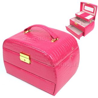 Шкатулка для украшений выполнена в виде сундучка 24*17*16 см из лаковой искусственной кожи. Шкатулка "Линдси" трёхъярусная, полный автомат. Нижний выдвижной ярус состоит из одного отделения, средний ярус разделён на четыре вместительных отсека для хранения крупных украшений, в верхнем ярусе расположены три отделения, одно из которых оснащено валиками для колец. Внутренняя сторона крышки оборудована зеркальцем. Шкатулка закрывается на замок-защёлку с ключиком и имеет удобную ручку-переноску. Внутренняя поверхность шкатулки оформлена светлым флоком, что придаёт ей шарм и изысканность.
