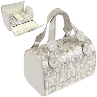 Шкатулка для украшений размером 22*15*14 см (без учёта ручек) выполнена в виде сумочки из серебристой искусственной кожи. Боковые створки шкатулки раскрываются в стороны, подобно цветку, открывая доступ к милым сердцу драгоценностям. Съёмное центральное отделение разделено на три отсека: с крышечкой, с валиками для хранения колец и с перегородками для серёжек. Внутреннее отделение из трёх частей подойдёт для хранения крупных украшений и бижутерии, а в кармашках, которыми оборудоманы створки шкатулки, можно разместить цепочки, часы и браслеты. Шкатулка закрывается на замок-защёлку с ключиком и имеет удобные ручки для переноски. Внутренняя поверхность шкатулки оформлена светлой бархатистой обивкой, что придаёт ей шарм и изысканность.