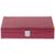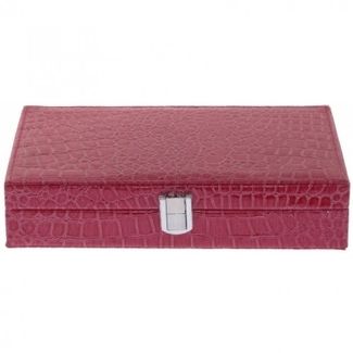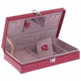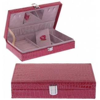 Шкатулка для украшений выполнена в виде чемоданчика 25*15*6 см из лаковой красной искусственной кожи с текстурным декоративным тиснением под кожу рептилии. Шкатулка одноярусная, состоит из четырех отсеков для разделения украшений по видам и коллекциям, включая один отсек с валиками для колец. Внутренняя сторона крышки оборудована зеркалом, кармашком по всей ширине крышки и четырьмя крючками. Чемоданчик закрывается с помощью замка. Внутренняя поверхность шкатулки оформлена светлым флоком, что придаёт ей шарм и изысканность.