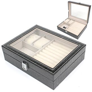 Шкатулка для часов и украшений размером 26*20*7 см выполнена из искусственной кожи. Внутри шкатулка "Меган" разделена на четыре отсека, один из которых оборудован валиками для колец, ещё два оснащены валиками для удобного и наглядного хранения часов или браслетов, и одно открытое отделение. Крышка прозрачная, а закрывается шкатулка на замочек. Внутренняя поверхность шкатулки оформлена светлым флоком, что придаёт ей шарм и изысканность.