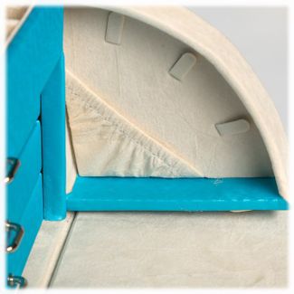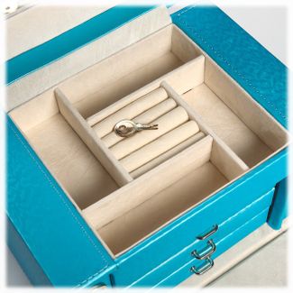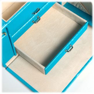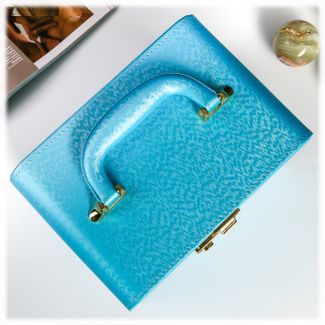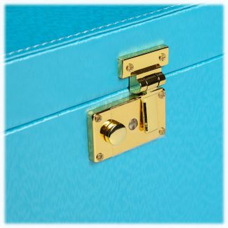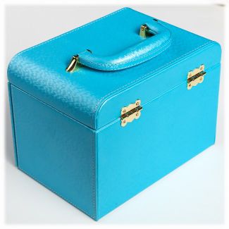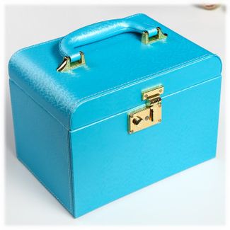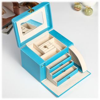 Шкатулка для украшений выполнена в виде сундучка 22*16*16 см из голубой искусственной кожи. "Месси" - вместительная четырёхъярусная шкатулка. В верхнем ярусе расположены отделения, среди которых отсеки с валиками для колец и прочих небольших украшений, каждое из которых требует собственного пространства. Второй, третий и четвёртый ярусы представляют собой выдвижные ящики для цепочек и браслетов. Внутренняя сторона крышки шкатулки "Месси" оборудована зеркалом 14*8 см. Шкатулка закрывается на замок-защёлку с ключиком и имеет удобную ручку-переноску. Боковые стенки шкатулки выдвигаются с обеих стороны, на них с внутренней стороны размещены крепления и кармашек для цепочек и подвесок - очень удобное место, чтобы повесить украшения и избежать их спутывания. Внутренняя поверхность шкатулки оформлена искусственной светлой замшей, что придаёт ей шарм и изысканность.