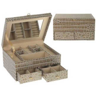 Шкатулка для украшений выполнена в виде сундучка 22*18*12 см из лаковой песочно-коричневой искусственной кожи с фактурой под кожу рептилии. Шкатулка "Моргана" двухъярусная. Нижний ярус представляет собой два выдвижных с ограничителями ящика по четыре отделения в каждом. Верхний ярус состоит из шести разноразмерных отделений, три из которых оснащёны валиками для удобного и наглядного хранения колец, и два отделения разделены при помощи съёмных перегородок на два отсека каждый. Внутренняя сторона крышки оборудована зеркалом 16*12 см, а вся внутренняя поверхность шкатулки оформлена искусственной светлой замшей, что придаёт ей шарм и изысканность.