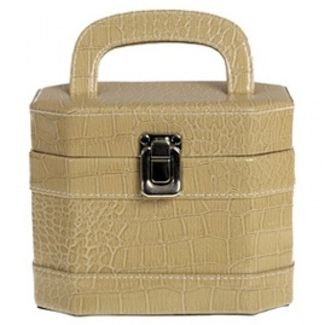 Восьмиугольная шкатулка для украшений размером 17*14*12 см выполнена из лаковой искусственной кожи бежевого цвета с декоративным тиснением под кожу питона. Съёмное отделение содержит два боковых отсека для украшений, разделённых посередине отсеком с валиками для колец и отсеком с крышечкой. Три части объёмного внутреннего отделения подойдут для хранения крупных украшений и бижутерии. Внутренняя сторона крышки оборудована зеркальцем. Шкатулка закрывается на замок-защёлку и имеет удобную складывающуюся ручку-переноску. Внутренняя поверхность шкатулки оформлена искусственной светлой замшей, что придаёт ей шарм и изысканность.
