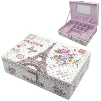 Шкатулка для украшений выполнена в виде чемоданчика 24*16*7 см из искусственной кожи с текстурным декоративным тиснением и великолепным рисунком. Шкатулка одноярусная, состоит из множества отсеков для разделения украшений по видам и коллекциям, включая два отсека с валиками для колец. Внутренняя сторона крышки оборудована зеркалом, кармашком по всей ширине крышки и двумя крючками. Чемоданчик закрывается с помощью замка. Внутренняя поверхность шкатулки оформлена светлым флоком, что придаёт ей шарм и изысканность.