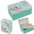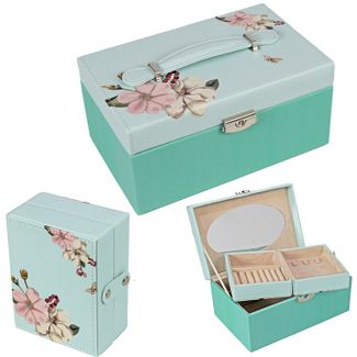 Шкатулка для украшений выполнена в виде чемоданчика 24*16*12 см из искусственной кожи с очень интересным дизайном. Шкатулка двухъярусная, верхний съёмный ярус состоит из отделений различных форм и размеров, включая отсек с валиками для колец, для разделения украшений по видам и коллекциям. Большим преимуществом этой шкатулки является то, что верхний ярус является клатчем и легко превращается в небольшую шкатулочку для украшений дорожного размера, на поверхность которой также нанесён рисунок, по стилю и дизайну совпадающий с тематикой основной шкатулки. Под съёмной частью располагается нижняя область для хранения более крупных украшений. Внутренняя сторона крышки оборудована зеркалом. Чемоданчик закрывается с помощью замка. Внутренняя поверхность шкатулки оформлена мягким флоком, что придаёт ей шарм и изысканность.