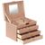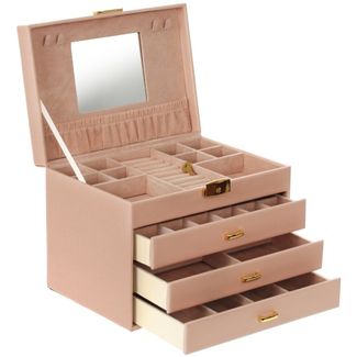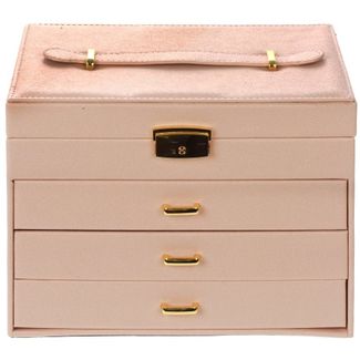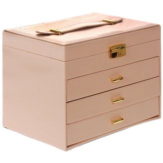 Шкатулка для украшений выполнена в виде сундучка 26*20*19 см из розовой искусственной кожи. "Райли" - удобная четырёхъярусная шкатулка. Нижний ярус представляет собой выдвижной ящик с четырьмя отделениями для браслетов и подвесок. Второй ярус - это выдвижной ящик, разделённый съёмными перегородками на четыре части. Третий ярус так же выдвижной и состоит из 24 небольших отсеков для разделения украшений по коллекциям. В верхнем четвёртом ярусе расположены 11 отделений, один из которых оборудован валиками для удобного хранения колец. Внутренняя сторона крышки оборудована зеркалом 10*12 см, а так же крючками и кармашком для размещения цепочек. Шкатулка закрывается на замок с ключом и имеет удобную ручку-переноску. Внутренняя поверхность шкатулки оформлена искусственной светлой замшей, что придаёт ей шарм и изысканность.