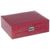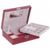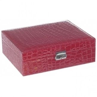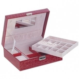 Шкатулка для украшений выполнена в виде чемоданчика 24*19*8 см красного цвета из лаковой искусственной кожи с текстурным декоративным тиснением под кожу рептилии. Шкатулка двухъярусная, верхний съёмный ярус состоит из отделений различных форм и размеров, включая отсек с валиками для колец, для разделения украшений по видам и коллекциям. Под съёмной частью располагается нижняя область из девяти отсеков для хранения более крупных украшений, а также валики для хранения часов и браслетов. Внутренняя сторона крышки оборудована зеркалом, кармашком по всей ширине крышки и крючками для хранения цепочек. Чемоданчик закрывается с помощью замка на ключ. Внутренняя поверхность шкатулки оформлена мягким светлым флоком, что придаёт ей шарм и изысканность.