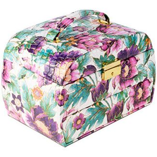 Шкатулка для украшений выполнена в виде сундучка 24*17*16 см из лаковой искусственной кожи с ярким и оригинальным дизайном. Шкатулка "Сабелла" трёхъярусная, полный автомат. Нижний выдвижной ярус состоит из одного отделения, средний ярус разделён на четыре вместительных отсека для хранения крупных украшений, в верхнем ярусе расположены три отделения, одно из которых оснащено валиками для колец. Внутренняя сторона крышки оборудована зеркальцем. Шкатулка закрывается на замок-защёлку с ключиком и имеет удобную ручку-переноску. Внутренняя поверхность шкатулки оформлена светлым флоком, что придаёт ей шарм и изысканность.