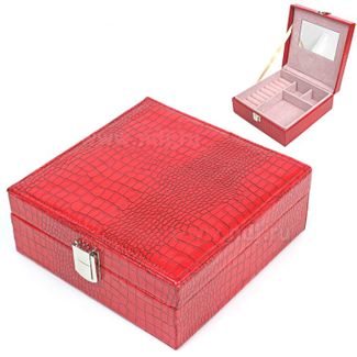 Шкатулка для украшений 17*17*7 см выполнена из красной искусственной кожи с фактурой под кожу рептилии. Шкатулка "Саммер" одноярусная, разделена на четыре отсека, один из которых оборудован валиками для колец. Внутренняя сторона крышки оборудована зеркальцем, шкатулка закрывается на замок. Внутренняя поверхность шкатулки оформлена светлым флоком, что придаёт ей шарм и изысканность.
