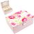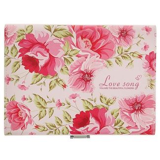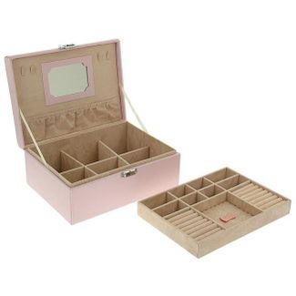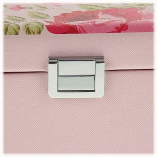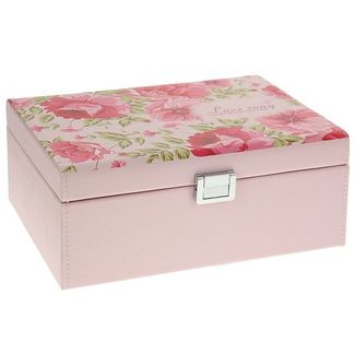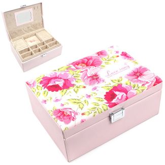 Шкатулка для украшений выполнена в виде чемоданчика 26*19*11 см из искусственной кожи с ярким изящными рисунком. Шкатулка двухъярусная, верхний съёмный ярус состоит из отделений различных форм и размеров, включая два отсека с валиками для колец, для разделения украшений по видам и коллекциям. Под съёмной частью располагается нижняя область из отсеков для хранения более крупных украшений. Внутренняя сторона крышки оборудована зеркалом, кармашком по всей ширине крышки и четырьмя крючками. Чемоданчик закрывается с помощью замка. Внутренняя поверхность шкатулки оформлена мягким нежным флоком, что придаёт ей шарм и изысканность.