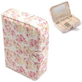 Шкатулка для украшений выполнена в виде книжки 20*14*5 см из искусственной кожи с нежным рисунком. Шкатулка одноярусная, состоит из множества отсеков для разделения украшений по видам и коллекциям, включая отсек с валиками для колец. Внутренняя сторона крышки оборудована зеркалом и кармашком по всей ширине крышки. Чемоданчик закрывается с помощью заклёпки. Внутренняя поверхность шкатулки оформлена светлым флоком, что придаёт ей шарм и изысканность.