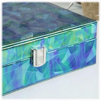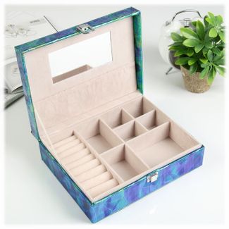 Шкатулка для украшений выполнена в виде клатча 25*19*8 см из искусственной кожи потрясающего переливающегося цвета. Шкатулка "Шелия" одноярусная, разделена на множество разнообразных отсеков, один из которых оборудован валиками для колец, а внутренняя сторона крышки оснащена кармашком и зеркалом. Внутренняя поверхность оформлена бархатистым светлым материалом, что придаёт ей шарм и изысканность.