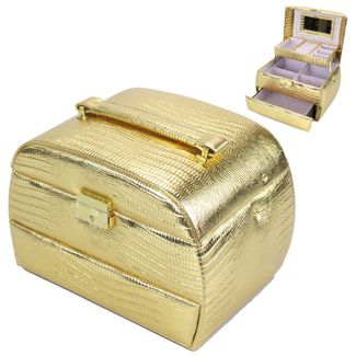 Шкатулка для украшений выполнена в виде сундучка 21*16*16 см из искусственной кожи золотистого цвета. Шкатулка "Шэрон" трёхъярусная, полный автомат. Нижний выдвижной ярус состоит из одного отделения, средний ярус разделён на четыре вместительных отсека для хранения крупных украшений, в верхнем ярусе расположены три отделения, одно из которых оснащено валиками для колец. Внутренняя сторона крышки оборудована зеркальцем. Шкатулка закрывается на замок-защёлку с ключиком и имеет удобную ручку-переноску. Внутренняя поверхность шкатулки оформлена светлым флоком, что придаёт ей шарм и изысканность.