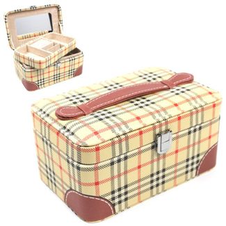 Шкатулка для украшений выполнена в виде чемоданчика 20*13*10 см из искусственной кожи со стильным дизайном. Шкатулка двухъярусная, верхний съёмный ярус состоит из отделений различных форм и размеров, включая отсек с валиками для колец, для разделения украшений по видам и коллекциям. Под съёмной частью располагается нижняя область для хранения более крупных украшений. Внутренняя сторона крышки оборудована зеркалом. Чемоданчик закрывается с помощью замка. Внутренняя поверхность шкатулки оформлена мягким флоком, что придаёт ей шарм и изысканность.