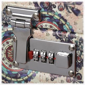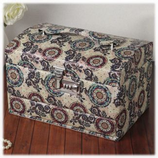 Шкатулка для украшений выполнена в виде сундучка 30*21*20 см из искусственной кожи. Шкатулка "Сумали" трёхъярусная, полный автомат. Нижний выдвижной ярус состоит из двух просторных отделений, средний ярус разделён на шесть вместительных отсеков для хранения крупных украшений, в верхнем ярусе расположены четыре отделения, одно из которых оснащено валиками для колец. Внутренняя сторона крышки оборудована зеркальцем 14*7 см. Шкатулка закрывается на кодовый замок и имеет удобную ручку-переноску. Внутренняя поверхность шкатулки оформлена светлым флоком, что придаёт ей шарм и изысканность.