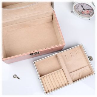 Шкатулка для украшений выполнена в виде чемоданчика 24*15*12 см из искусственной кожи. Шкатулка "Валери" двухъярусная, верхний съёмный ярус разделён на два отсека, один из которых оборудован валиками для колец, также есть крючки и кармашек для хранения браслетов и цепочек. Особенность этой шкатулки в том, что верхний ярус является клатчем и легко превращается в небольшую шкатулочку для украшений дорожного размера 14*11*6 см, по стилю и дизайну совпадающий с тематикой основной шкатулки, размеры которой позволяют взять её с собой в любую поездку или путешествие, бережно храня в ней милые сердцу украшения. Под съёмной частью располагается нижняя область для хранения более крупных украшений. Внутренняя сторона крышки основной шкатулки оборудована зеркалом 19*10 см. Чемоданчик закрывается с помощью замка с ключиком. Внутренняя поверхность шкатулки оформлена мягким флоком, что придаёт ей шарм и изысканность.