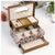 Шкатулка для украшений выполнена в виде сундучка 23*17*12 см из искусственной кожи. Шкатулка "Валия" трёхъярусная, полный автомат. Нижний выдвижной ярус состоит из одного отделения, средний ярус разделён на шесть вместительных отсеков для хранения разных коллекций украшений, в верхнем ярусе расположены три отделения, одно из которых оснащено валиками для колец. Внутренняя сторона крышки оборудована зеркальцем 12*6 см. Шкатулка закрывается на замок-защёлку с ключиком и имеет удобную ручку-переноску. Внутренняя поверхность шкатулки оформлена светлым флоком, что придаёт ей шарм и изысканность.