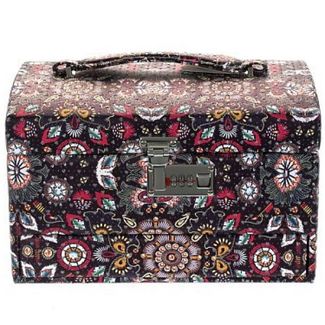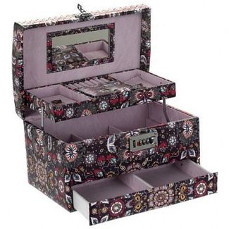 Шкатулка для украшений выполнена в виде сундучка 30*21*20 см из искусственной кожи. Шкатулка "Велора" трёхъярусная, полный автомат. Нижний выдвижной ярус состоит из двух просторных отделений, средний ярус разделён съёмными перегородками на шесть вместительных отсеков для хранения крупных украшений, в верхнем ярусе расположены четыре отделения, одно из которых оснащено валиками для колец. Внутренняя сторона крышки оборудована зеркальцем 14*7 см. Шкатулка закрывается на кодовый замок и имеет удобную ручку-переноску. Внутренняя поверхность шкатулки оформлена светлым флоком, что придаёт ей шарм и изысканность.