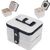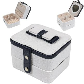 Шкатулка для украшений размером 11*9*8 см двухъярусная и выполнена из искусственной кожи. Нижнее отделение содержит пять отсеков для украшений, включая отсек с валиками для колец. Там же расположены крючки и кармашек для цепочек и браслетов. Верхнее отделение разделено на четыре отсека. Внутренняя сторона крышки оборудована зеркальцем. Внутренняя поверхность шкатулки оформлена светлым флоком, что придаёт ей шарм и изысканность.