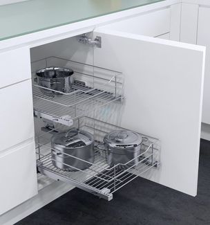 В комплекте 2 корзины, направляющие GRASS с доводчиком плавного закрывания, 4 дистанционные планки (обеспечивает выдвижение, не задевая петли), сетка "Классик", хромированные, нагрузка до 20 кг. на систему. None