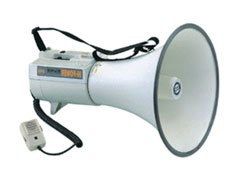 Мегафон с плечевым ремнем 45 Вт выносной микрофон, линейный вход радиус действия по данным производителя 500-700 метров возможность установки на штативе сирена, вес 3.3 Кг., Питание: 15В. (Батареи R20 C 10 шт., 12В. от автомобильной розетк Необходима предоплата не менее 10%.