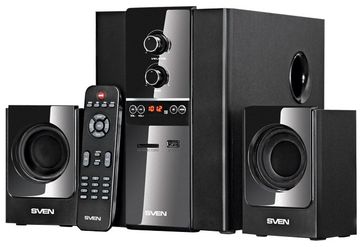 - sven (sven ms-1820 чёрный, акустическая система 2.1, мощность(rms):18Вт+2х11 Вт, fm-тюнер, usb sd, дисплей, ПДУ) sv-01301820bk по выгодной цене 3 084 р. руб.;