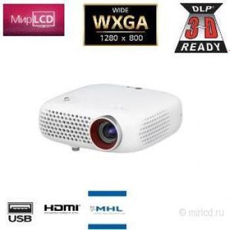 3D портативный проектор WXGA (1280 x 800). 3D Ready через DLPLink. Портативный светодиодный проектор с поддержкой 3D (DPL Link), USB, HDMI и MHL. Тип дисплея DLP. Собственное разрешение WXGA (1280 x 800). Размер экрана 63.5 - 254 см. Размер проецируемого изображения 101 см. Соотношение сторон 16:9 / 4:3. Яркость (лм) до 600 люменов. Коэффициент контрастности 100 000:1. Цифровая коррекция трапецеидальных искажений по вертикали. Тип лампы LED RGB. Срок службы лампы до 30000 часов. Возможности подключения USB Host (DivX, MP3, Фото). Встроенные динамики 1 Вт + 1 Вт стерео. HDMI 1 (MHL). USB 1 (тип А). WXGA резкие снимки и более яркие цвета, чем стандартный HD, чтобы показать Вашу презентацию и наслаждаться развлечениями. HD DivX воспроизведение фильмов и фотографий в формате HD с USB. HDMI подключение. Получите лучший опыт с меньшим количеством проводов. Один, цифровой вход позволяет легко подключать и интегрировать все свои цифровые системы, включая кабельное / спутниковое ТВ и игровые приставки. Смотрите свой контент на большом экране. Подключите совместимое мобильное устройство к телевизору с помощью кабеля MHL, чтобы увидеть контент на Вашем LG Smart TV. С совместимым мобильным телефоном, Вы можете использовать интуитивный Magic Remote для управления контентом на большом экране. С MHL, Вы можете быстро показать содержимое с телефона на телевизоре без доступа к сети. None