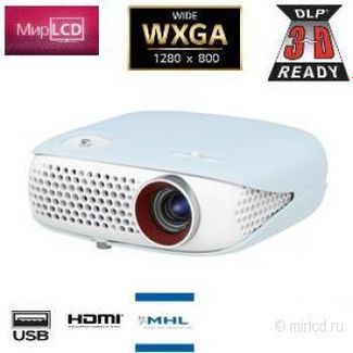 3D портативный проектор WXGA (1280 x 800). 3D Ready через DLPLink. Портативный светодиодный проектор с поддержкой 3D (DPL Link), USB, HDMI и MHL. Тип дисплея DLP (1.143 см). Собственное разрешение WXGA (1280 x 800). Размер экрана 63.5 - 254 см. Размер проецируемого изображения 101 см. Соотношение сторон 16:9 / 4:3. Яркость (лм) до 800 люменов. Коэффициент контрастности 100 000:1. Фокус объектива ручной. Увеличение (Zoom) фиксированный. Цифровая коррекция трапецеидальных искажений по вертикали. Тип лампы LED RGB. Срок службы лампы до 30000 часов. Возможности подключения USB Host (DivX, MP3, Фото). Встроенные динамики 1 Вт + 1 Вт стерео. HDMI 1 (MHL). USB 1 (тип А). LG MiniBeam PW800G дает Вам кинематографический опыт просмотра на большом экране до 254 см. LG PW800G создаст эфект погружения в Ваш домашний кинотеатр и Вы будете чувствовать себя, как в кинотеатре. PW800G способен подключить мобильное устройство не только без проводов по Wi-Fi, но и с помощью кабеля (HDMI / MHL / SlimPort). Высокоэффективный светодиодный LED источник света со сроком работы до 30 000 часов, что позволит работать в течении 4-х часов в день 20 лет, прежде чем придется заменить лампу! Live TV в любом месте. Для того, чтобы наслаждаться в режиме реального времени спортивными играми и телевизионными шоу, приставку кабельного, спутникового телевидения или IP TV. Ноутбук не обязателен. Создание важной презентации? Просмотр видео? Вам больше не надо подключать и отключать Ваш компьютер. Просто подключите накопитель USB и просматривайте файлы PPT, Excel, Word и многое другое. Коэффициент контрастности 100 000 : 1 + процессор Triple XD Engine. Эффективный светодиодный источник света обеспечивает на 114% более широкую цветовую гамму по сравнению с обычными лампами с коэффициентом контрастности эталонного качества, в то время как LG Triple XD Engine дает точное, естественное качество изображение. Беспроводное Wi-Fi соединение с мобильными устройствами. В отличие от обычных проекторов, LG PW800G обесп