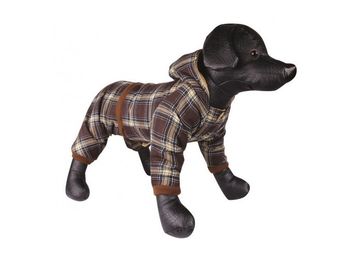 Комбинезон из мягкой ткани с расцветкой в шотландскую клетку и мягкой, теплой подкладкой из флиса. Предназначен для использования в сухую, прохладную и ветренную погоду. Рукава на передние и задние лапы, отстегивающийся капюшон на кнопках. 100% полиэстер, только сухая чистка.