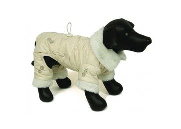Комбинезон стеганый с мягкой, теплой флисовой подкладкой. Предназначен для использования в прохладную, ветреную погоду. Рукава на передние и задние лапы, застежка на липучках. Фиксирующая резинка для более плотного облегания талии. 100% полиэстер, стирать в холодной воде, не выжимать.