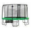 В комплекте батута идет двухступенчатая лестница и мешок для обуви. Цвет мата батута — черный, подушки безопасности — зеленый, стойки батута — черный. Подушка безопасности находится внутри защитной сетки. Ножки батута и вертикальные стойки, которые держат сетку, сделаны из оцинкованной стали. Мат батута — полипропилен, подушка безопасности — ПВХ, внутри — поролон, обмотка стоек батута — ПВХ, сетка батута — полиэтилен. Батут подходит для использования как внутри помещения, так и на улице. Количество пользователей одновременно — не больше одного человека.