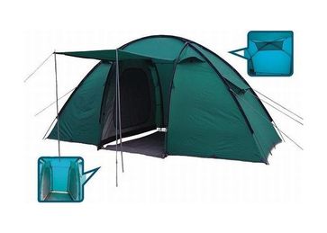 4-х местная двухслойная палатка, размер: 255 х 140 + 135 + 140 х 180/210 см, внешний тент: полиэстер 2000 мм/в.ст., внутренний тент: «дышащий» полиэстер, пол: армированный полиэтилен, каркас: трубки, стекловолокно + сталь, два входных проема по бокам палатки, два спальных отсека + жилой отсек посередине, вытяжки сверху и по бокам палатки, проклеенные швы, сумка и колышки входят в комплект, вес: 13,93 кг None