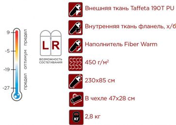 Нижний температурный предел: -27°C Верхний температурный предел: +9°C Оптимальная температура комфотра: от -5°C до -19°C Вес: г 2800 Вес в упаковке: г 3000 Размер в мешке (ДхШхВ): см 47x28x28 None