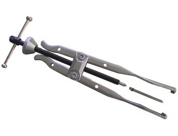 Съёмник подшипников предназначен для демонтажа подшипников, шестерен, шкивов и други деталей установленных в натяг. Конструкция съёмника позволяет работать с подшипниками, расположенными в углублении или труднодоступных местах. Съёмник имеет несколько положений регулировки глубины захватов, а также две насадки разной длины, позволяющие работать с подшипниками небольших размеров.