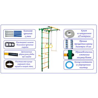 Размер: 2200х900х750 ммХарактеристики:Страна производитель: РоссияКомплектация: Канат, кольца гимнастические, трапецияТип упаковки: Коробка картонная, пленка полиэтиленРазмеры упаковки: 1220440140 ммОбъем: 1,485 м3Вес: 20 кгМаксимальная нагрузка: 120 кгТип установки: пристенныйСпособ установки: крепление к стене на 4 точки (анкера в комплект не входят)Регулировка турника по высоте: не регулируетсяШирина металлической перекладины: 460 мм, труба Ø25 ммТип перекладин: с ПВХ покрытием, толщина 2 ммШирина турника: 900 ммНагрузка на навесное оборудование: 100 кгДлина крепежа (расстояние от стены до стоек): 750 ммДиаметр трубы: 42 ммГарантия: 1 месяцСпортивный детский уголок «Юный Атлет» серии Лайт, отличный вариант для ребенка и его друзей, чтобы отвлечь их от каждодневных бесполезных дел, шумных и опасных игр, не выходя из дома. Благодаря соотношению цены и качества шведская стенка «Юный Атлет» Лайт стала наиболее популярной моделью среди наших покупателей, так как, это целый мир для ребенка, включающий в себя трапецию, канат и гимнастические кольца. Модель «Юный Атлет» Лайт разработана в очень ярких цветовых гаммах, таких как красный-желтый, зеленый-желтый, синий-желтый и практически не займет места в помещении, при этом, пристенный спортивный комплекс «Юный Атлет» Лайт включает в себя все необходимое навесное оборудование для занятий и сделан из прочных и безопасных материалов.В игру можно включать сразу несколько человек, об этом говорит максимальный вес нагрузки в 120 кг при весе всего 22 кг. Установка ДСК « Юный Атлет» так же, не займет много времени, крепление осуществляется к стене с помощью 4 анкеров ( не поставляются в комплекте). С помощью эргономичной формы ручек, оптимизированных для захвата и нескользящих перекладин с ПВХ покрытием, можно добиться устойчивого положения для ребенка. Домашний спортивный комплекс «Юный Атлет» Лайт – хороший вариант, если нужно компактное и надежное изделие, которое вы можете приобрести в нашем магазине. В дальнейшем ест