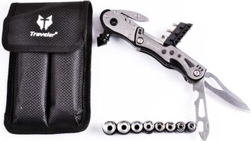 Универсальный инструмент - аварийноспасательный комплект с фонариком MS005 для автомобилистов. Основное лезвие, универсальный консервный нож с гаечными отверстиями. Стропорез для ремней безопасности. Твердосплавный пробойник для разбивания автомобильных стекол. 3 отверточные биты, ключ трещотка с 8 головками - 5/6/7/8/9/10/11/12. Инструмент имеет встроенный микрофонарь LED, удобный чехол с петлей для ношения на поясе. None