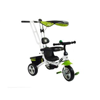 Детский трехколесный велосипед. Колеса широкие прорезиненные: диаметр переднего – 10", заднего – 8". Тент над головой защитит от солнца и дождя. Сверху предусмотрен клапан на липучке с окном-сеточкой. Тканевая багажная корзина для игрушек, куда можно сложить любимые формочки и машинки. Защитный бампер с мягкими накладками. На руле предусмотрена мягкая защитная накладка, ручки на руле прорезиненные. Для оповещения о своем приближении, стоит воспользоваться громким звонком. Велосипед оборудован складывающимися подножками. Широкое удобное сиденье с антискользящими вставками и удобным подголовником. Педали пластмассовые с резиновыми элементами. Пластиковое крыло защищает от грязи и брызг. Диски хромированные из пластика. Ручка-толкатель металлическая, с мягкими накладками. Есть дополнительный кармашек с двумя отделениями, который крепится на ручке управления. Предназначен для детей, весом не более 25 кг. None