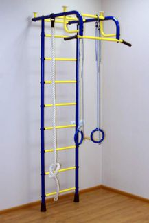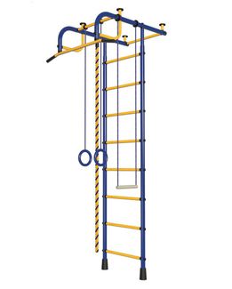 Сине-желтый ДСК Пионер-1М для детей и взрослых. Есть турник, шведская стенка, канат, трапеция, кольца. Установка - враспор. На перекладинах - мягкие накладки. Наличные, Visa/MasterCard, Яндекс.Деньги, WebMoney Возможен самовывоз. Есть доставка.