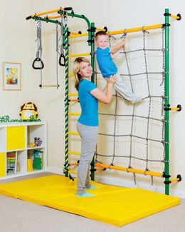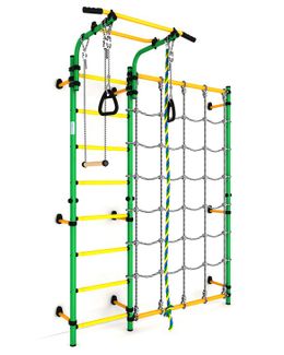 Спорткомплекс Romana Карусель S3 зелёно-жёлтый состоит из сетки для лазания, каната, гимнастических колец, турника, металлической лестницы. Пристенный механизм фиксации.