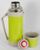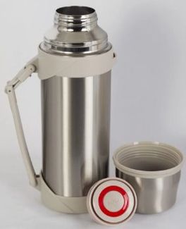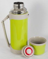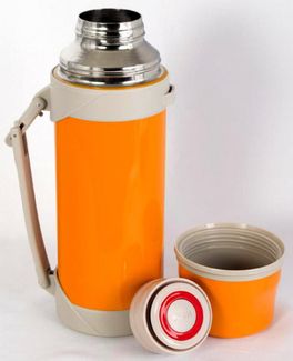 Термос с пластиковым корпусом и колбой из нержавеющей стали и пробкой, открывающейся при помощи кнопки. Сохраняет тепло до 12 часов, холод - до 18 часов. None