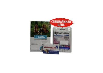Капли «Фронтлайн» для собак весом от 20 до 40 кг. Ошейник «Килтикс» для собак средних пород. Длина ошейника 48см. «Мильбемакс», таблетки для крупных собак (2 шт.) None