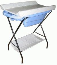Многофункциональная ванночка с подставкой для пеленания ребенка. Вся конструкция сделана из сверхпрочного и легкого пластика и металла. None